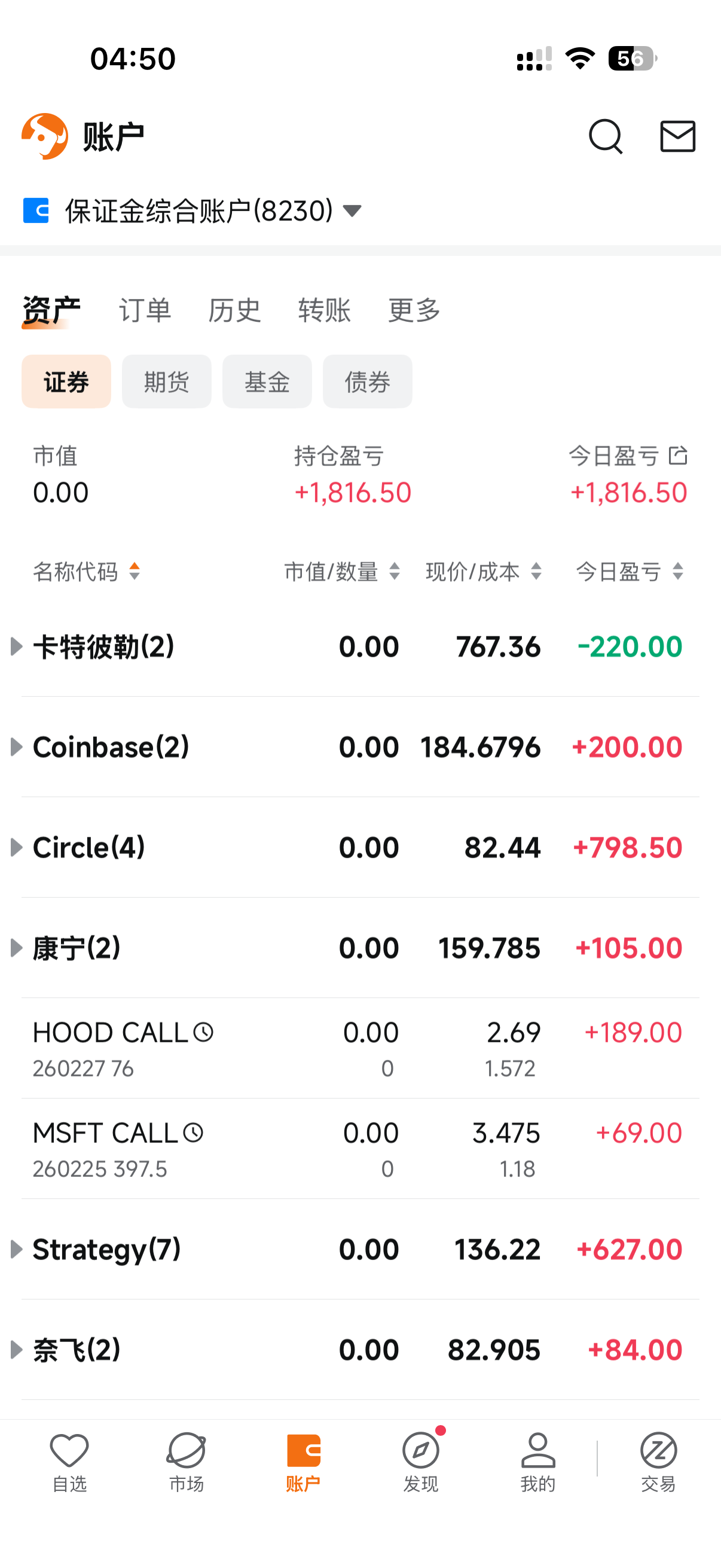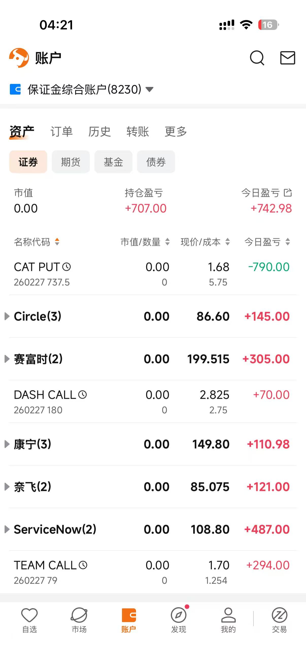 今天又是给富途打工的一天,账面利润742美金,实际上估计得有350美金左右的手续费。这几天操作完全不及格,特别是昨天的crcl,为什么不下重一点,另外昨晚觉得cat和glw可能会大跌,结果尾盘又全清掉了,否则有2两张cat,3张glw,今天最起码到手5000美金以上。这两天操作真的是太糟糕了.
